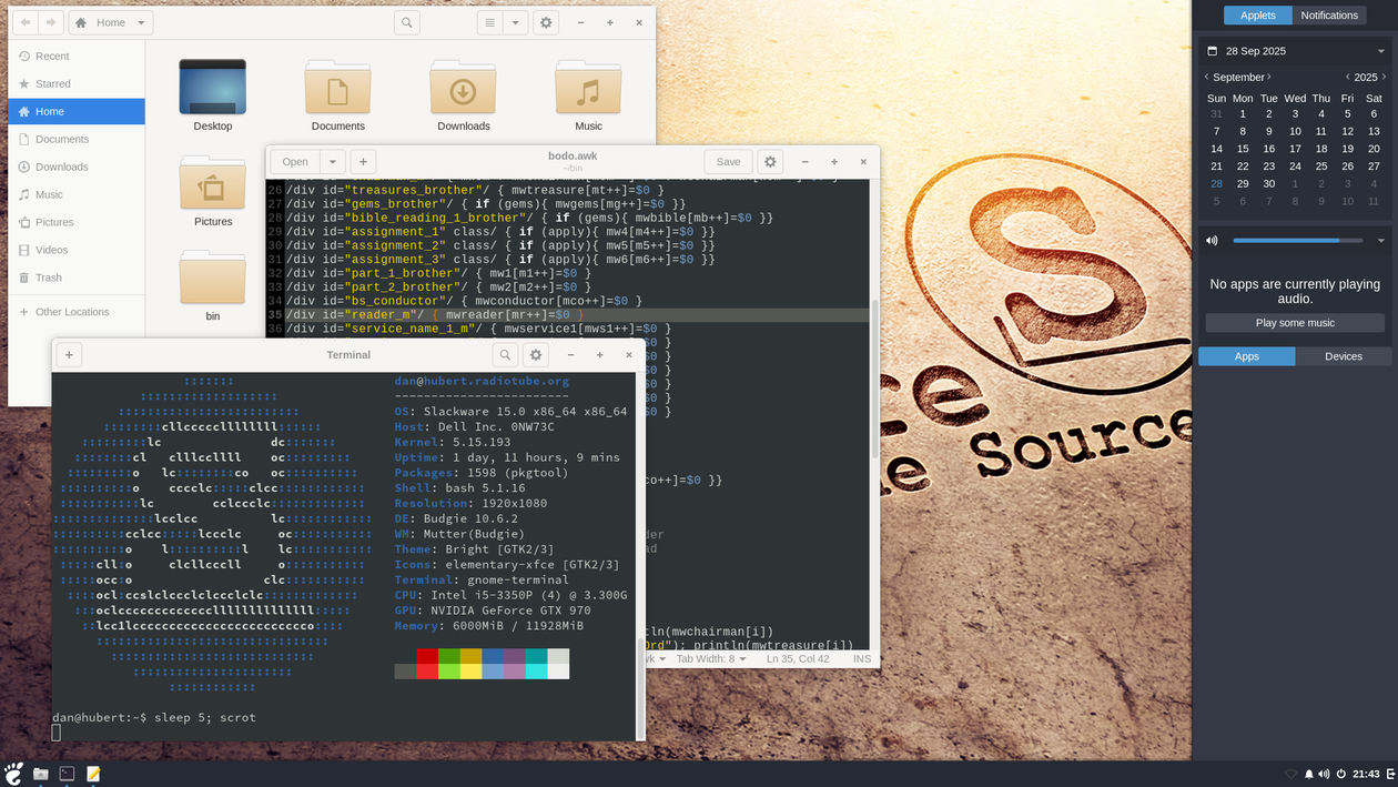To illustrate what you can do with Slackware I played around with a few desktops and window managers and include some screenshots. I have not included all available desktops, in particular there is a near unlimited amount of lightweight stacking and tiling window managers available for Linux, but I have tried to include a selection that will illustrate the breadth of choices. Of course there is no end to the limit of customizations you can do on most desktops, the examples shown here are just the result of a few minutes of tinkering. I am sure you can produce prettier (or uglier) setups yourself with modest efforts. (If you'd like a more indepth discussion of these desktops, you might find The Window Manager Desktop Guide of interest)