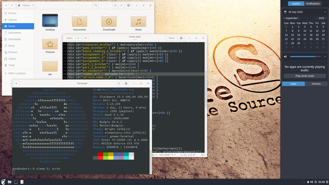At the end of the day the Slackware desktop experience is what you make of it. True, it does not have a huge and well tested repository compared to the likes of Debian, but it likely has what you need. There are certainly more slick and smooth distros out there (Void Linux and FreeBSD are two strong competitors if you like the KISS approach), but it's precisely the rough edges in Slackware that makes it interesting; Using it you gradually realize that there isn't a distro there, it's quite literally just a handful of shell scripts that automates installation, compilation and background processes. It drives you to dig deep into the applications themselves and really learn how a Linux system ticks, including all of its ungainly aspects. That said, it's much easier to install and use Slackware then most seem to think. We may have gone a bit overboard with whimsically convoluted examples in this article, but as the Initial Configurations section says, 10 minutes after installation you have a fully functional modern desktop, everything after that is optional tinkering.