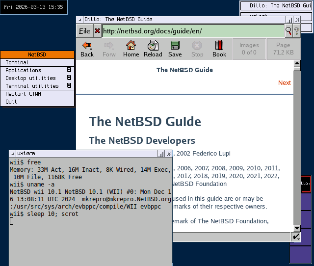 On the other hand, despite flagship GUI applications, the day-to-day work flow on such UNIX workstations were overwhelmingly done in the terminal. And in this area, running modern NetBSD has significant advantages over the commercial workstations from the 90's, such as; git, Unicode support, ssh, a package manager, sysadmin tools like tmux, ncdu and nnn, and powerful text editors. (modern vim and joe are more powerful then vi and joe from the 90's) Terminal applications do not suffer from the same toolkit inflation that GUI apps does, and over the years an impressive amount of useful programs have augmented this geeky environment. (this is less true then it used to be, as even terminal based applications are migrating to Rust, but for now at least, the modern command line is still a powerful tool on ancient devices) If you learn to love the terminal, you can absolutely convert a Nintendo Wii into a useful UNIX workstation!