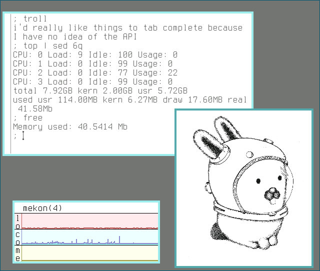 Ah, yes, this is a sore point... As you may have noticed already, we are having serious trouble running anything graphical on the Wii. Now, you might be thinking that X11 is the culprit; Normally, X11 eats between 50-100 Mb of RAM on modern devices - on a Nintendo Wii that would stomp the poor device like a cute mushroom! However, on my tests X11 only consume between 5-10 Mb. I'm not exactly sure how NetBSD manages to run X11 with so little memory, but I suppose the static 640x542 resolution might have something to do with it. (for a sense of scale; all the screenshots in this article are not thumbnails - they are full sized 1-to-1 screenshots) Given that the system itself needs ~20 Mb, you are still well within hardware limitations.